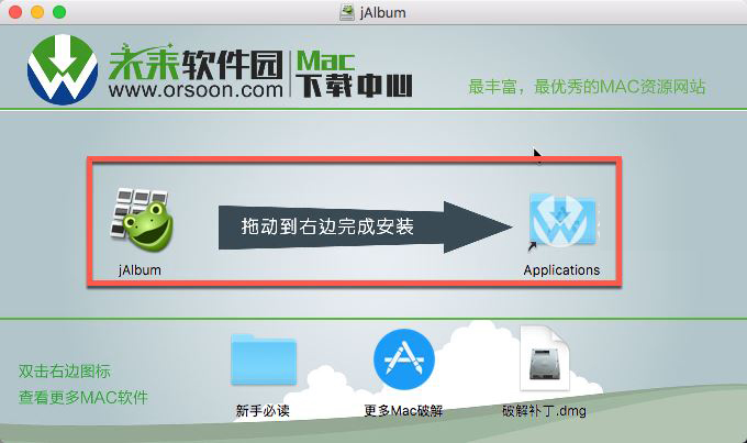下载软件完成后,打开软件包,拖动软件【jAlbum15】到应用程序进行安装.