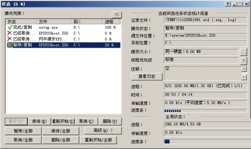 有了断点复制功能,在文件复制过程中,我们还可以随时中止复制任务,需要继续复制时,可以双击CH的系统托盘图标打开它的任务管理窗口(如图3),在这里可以看到没有完成和中断的复制进程,可以像使用下载软件一样续传、重新开始、暂停、取消、删除任务。