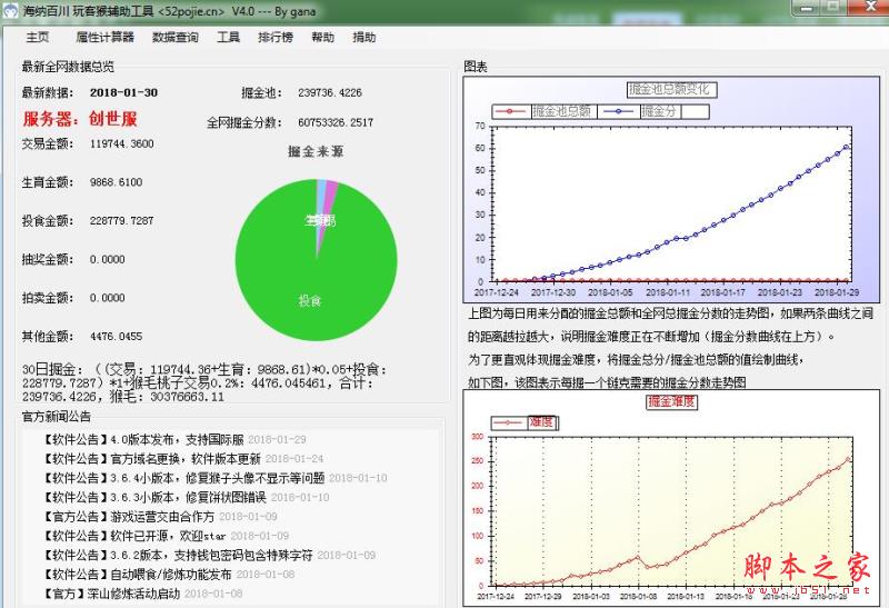 软件界面如下,也看到服务器的整体数据,包括掘金走势,掘金难度走势,以及最近一次的掘金组成等。