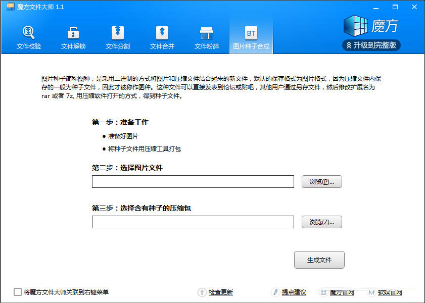 魔方文件大师是一款绿色小巧、简单实用的文件管理工具,魔方文件大师拥有文件合并、文件校验、文件分割、文件解锁、文件粉碎及图片种子合并六大功能,其中图片种子合并能够降低图片储存空间,适合发到论坛帖子,合成只需三步,非常不错,需要的朋友欢迎前来下载使用!