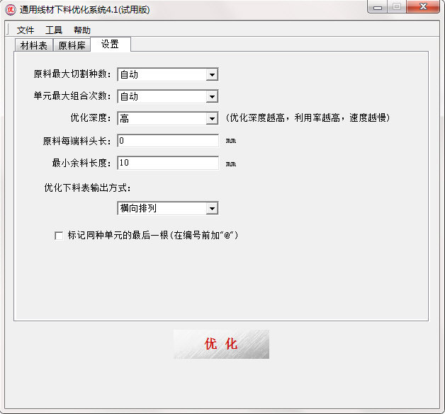 <1>. 原料最大切割种数: 设置单根原料的切割杆件种类数,这样既考虑利用率,又考虑了实际下料的方便性