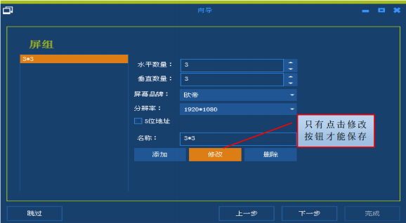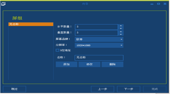 如有多个屏组,可以点击添加按钮;如需要删除多余屏组,则在屏组栏选中对应的屏组名称,点击删除按钮即可。屏组信息设置好后,单击下一步;