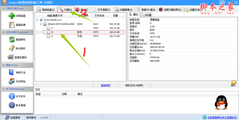 这一次就给大家演示一下怎么使用Gopro高清视频恢复工具扫描硬盘。首先点击Gopro高清视频恢复工具中的硬盘分区,然后点击Gopro高清视频恢复工具顶部工具栏中的[扫描],打开扫描功能;