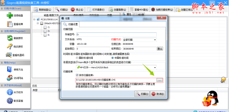 Gopro高清视频恢复工具要我们在扫描之前设置一个扫描结果保存路径,注意不要保存到同一个磁盘。选择好保存路径之后点击[确定]即可设定保存路径;