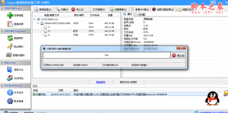 Gopro高清视频恢复工具正在扫描电脑的D盘分区,请耐心等待扫面完成。