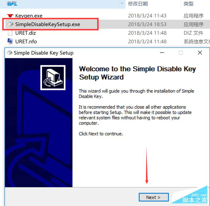 1.本站下载压缩包,解压后双击SimpleDisableKeySetup.exe安装吗,点next继续