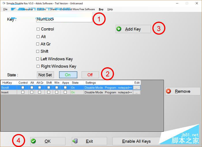 Simple Disable Key是一款简单禁用键允许您禁用或删除键盘上的特定按键功能/组合。此实用程序将为键盘按键无法正常工作或当您正在玩游戏并持续点击特定键时提供解决方案错误。您可以禁用它并继续进行活动。简单禁用密钥允许您选择要禁用密钥或组合的时间,并且您可以选择仅针对特定应用进行设置,可以在启动时运行,也可以根据需要按计划运行。您也可以通过系统托盘图标临时允许全键功能。小编这里带来的是中文最新版,内涵注册机,可以完美激活Simple Disable Key!