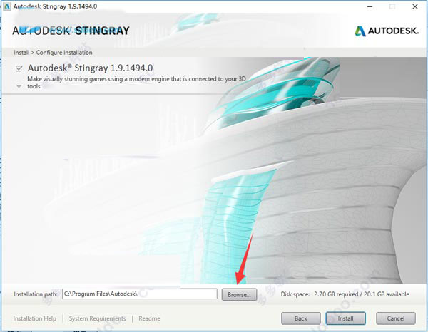2、双击Autodesk_Stingray_1_9_1494_0_EN_Win_64bit_dlm.sfx.exe运行,安装目录可以自行更改;