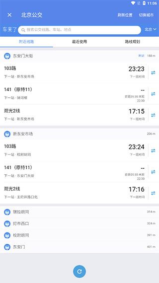 实际上是车来了的手机网站,该网站有bug:1.它自己的城市列表中没有广州、深圳、天津选择,其他的没有就是没有了;2.它不能自己定位。如需要刷新位置信息,可回到主地图页面重新定位好后再次进入就刷新了定位信息。