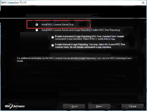 3、再双击msc_licensing_11.13.1_windows64.exe,勾选第一项install msc license server only,点击next;
