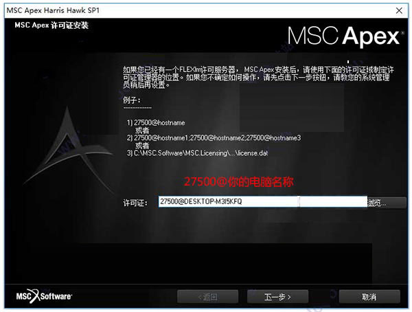 5、最后双击“apex_hawk_sp1_windows64.exe”文件,选择安装目录安装软件;并且在许可配置界面输入:27500@你的电脑名称,后面依提示安装即可;