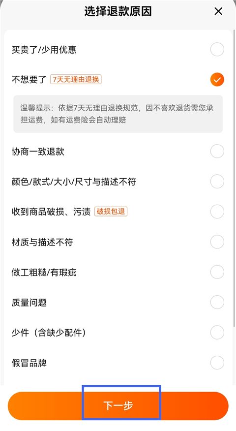 4、选择退款原因,点击【下一步】。