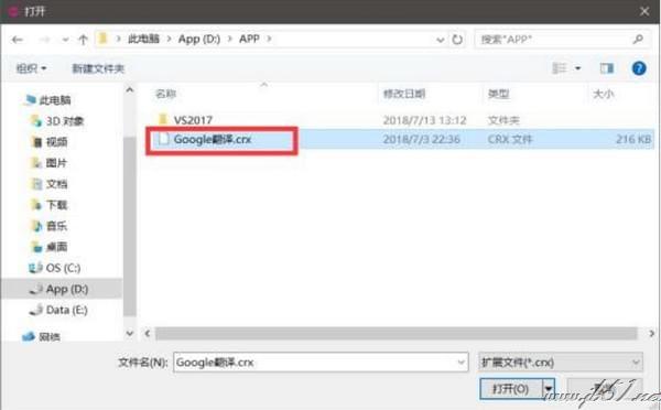 2、点击”选择插件”按钮,在弹出的文件选择框中,选择目标插件,也就是后缀名为crx的文件
