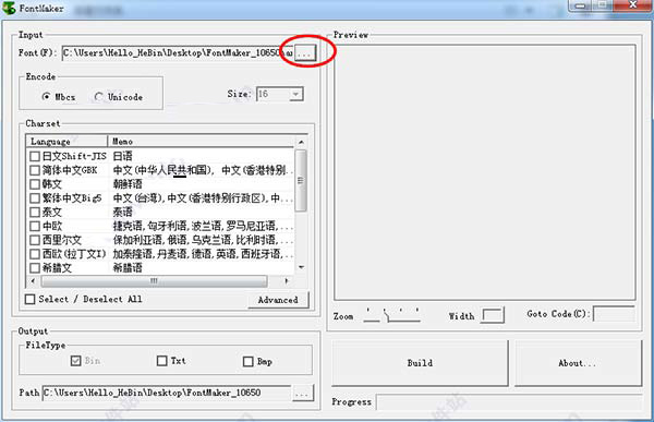 ①选择一个您要预览的字库文件(*.bin)。将会自动打开分析出其编码类型,点阵大小,包含的字符集。