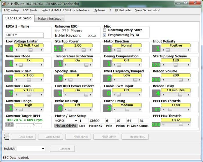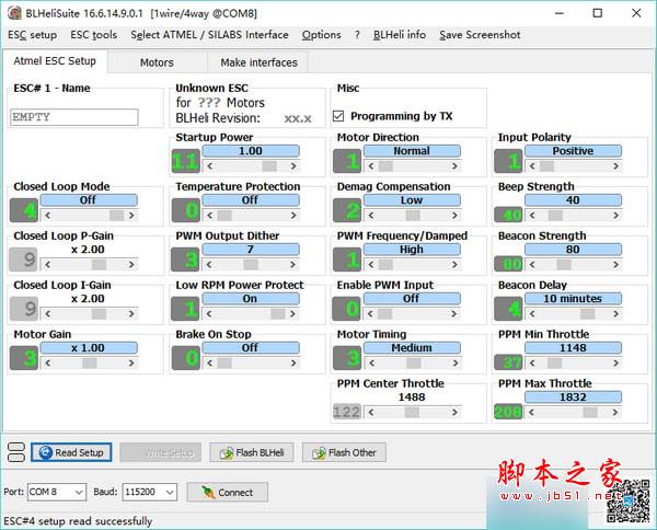 BLHeliSuite是一款十分不错的电调调参软件,软件的功能主要是用于校准电调和电机,需要使用串行端口连接后,启动软件后根据提示进行校准,移动滑块来测试电机,给电调上电读取电调信息,读取电调信息后可就以设置电调的以数了,支持电调固件刷写,本站提供的是该软件的绿色版本,需要的朋友不妨前来本站下载。