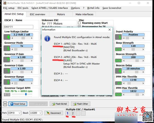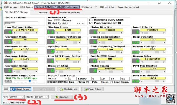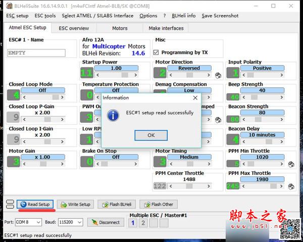 右键点击图中电调1,数字变成蓝色1,即为电调1被选中,在点击readsetup按键,就会出现电调1已成功读取完毕,接下来就可以设置电调的参数
