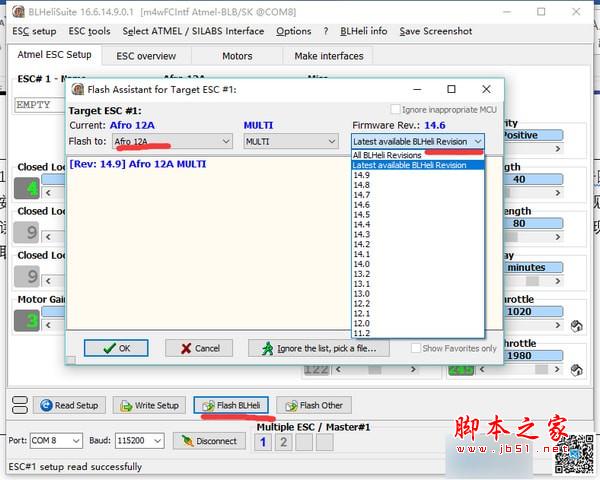 图是进行电调固件的刷写,点击FlashBLHeli,选择电调的安数,在选择较高的版本号,点击ok