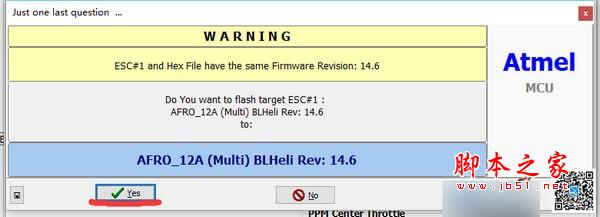就会出现如图所示,点击Yes后开始刷写固件,如果某些电调的版本较低,导致电调的数据读取不出来,可以进行固件刷写后再重新连读取即可