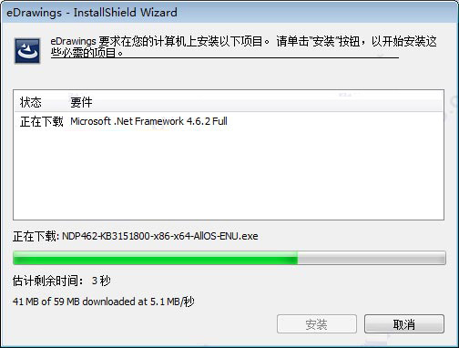 2、双击文件“eDrawingsFullAllX64.exe”安装原程序,如果你的电脑没有安装.net 4.6.2组件,将自动下载安装;