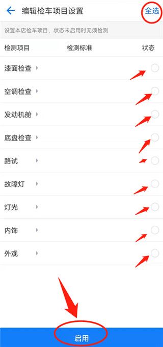 干大事前我们先要把检车项目设置这件小事做好!操作路径为:超级车店APP-发现-系统管理-检车项目设置-右上角选择-需要哪个就打勾即可-最下方启用