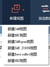 3. 子视图:如图 1.1 主界面所示,子视图占据了整个界面的大部分区域,用于展示收发的报文,通过点击工具栏上的“新建视图”,如图 1.3 新建视图所示,可以看到可添加的视图有CAN视图、DBC视图、CANopen视图、SAE J1939视图、DeviceNet视图和UDS视图,默认打开的是CAN视图,您可根据实际情况选择相应的视图;