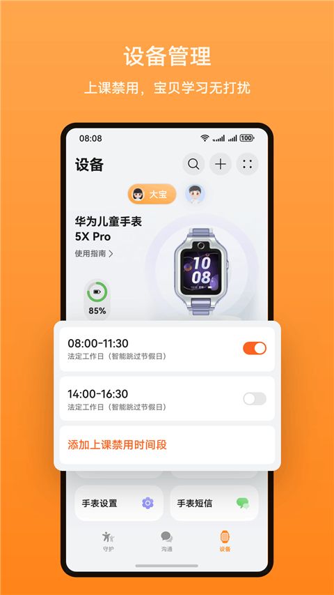 丰富设置:上课禁用、安全区域、定时开关机等,随时掌控手表。