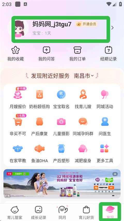 1、在育儿模式中,进入【发现】页,点击头像栏处。