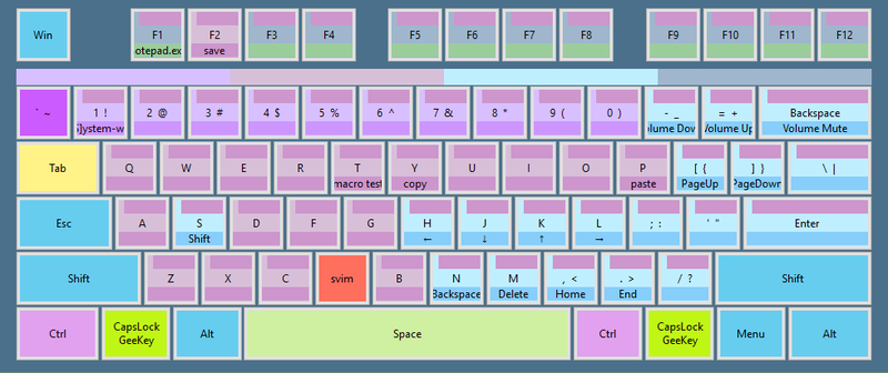 GeeKey 与 Esc, ~ , Tab, Shift, Ctrl, Win Alt 的按键位置可以通过svim面板进行交换(但需要以管理员模式运行程序才能操作,重启生效)。其余与GeeKey连用的映射则可以随时通过相应方式方便地进行修改。
