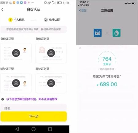 1、下载注册成功后,进行实名认证(需要上传身份证及驾驶 证的照片)。然后点击“下一步”进行免押认证,支付宝芝麻信用分大于等于650是可以免缴押金直接用车。如果芝麻信用分不达标,则需要支付押金699元。