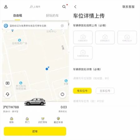 4、行程结束后,可在地图中查找附近免费停车场进行还车,也可在任意合法的停车位还车(需缴纳还车服务费)。为了共同维护好的用车体验,需要在还车时输入正确的停车位置,并上传车辆照片以便下一位租客方便找车,下车前请关好车窗并随手将垃圾带出,保持一个干净舒适的车内环境。