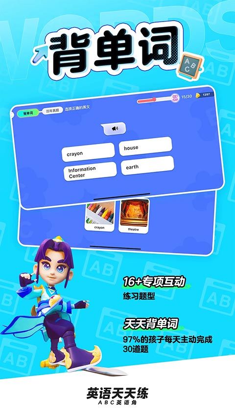 英语天天练app是由abc英语角app升级而来的一款在线英语学习软件。在这里,你可以一站式全面提升英语能力。它拥有丰富的单词库,涵盖从学龄前到高中阶段的39套同步教材,通过多感官互动的方式帮助你高效记忆单词,如听音选词、看图识词、听音抄写等。此外,你还可以刷真题、享受错题一对一辅导,实现高效做题。更有外教带你朗读课文,提升口语能力,助力高效英语学习。有需要的小伙伴快来在本站下载试试吧~