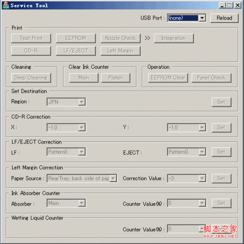 2、打开维修软件GeneralTool.exe。选择USB端口(一般会自动选择,如果不行,可以到打印机的属性里去看端口号是多少。