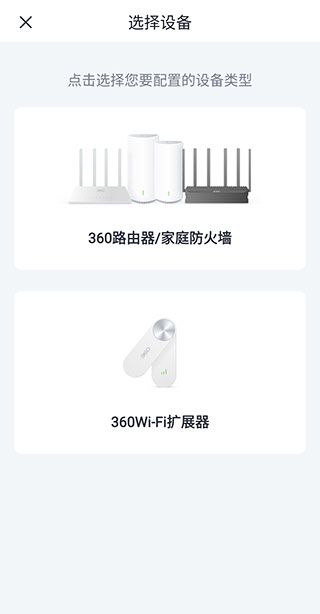2、按“360路由器/家庭防火墙”或者“360Wi-Fi扩展器”这两种类型来选择对应的设备进行配置,用户点击相应图片即可进行选择。