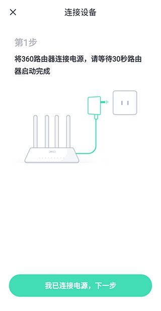 3、第1步将360路由器连接电源,请等待30秒路由器启动完成,完成这一步后,再点击下方的绿色按钮。