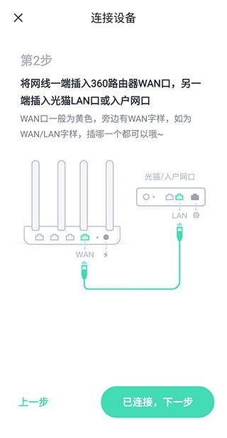 4、第2步将网线一端插入360路由器WAN口,另一端插入光猫LAN口或入户网口,WAN口一般为黄色,旁边有WAN字样,如为WAN/LAN字样,插哪一个都可以。