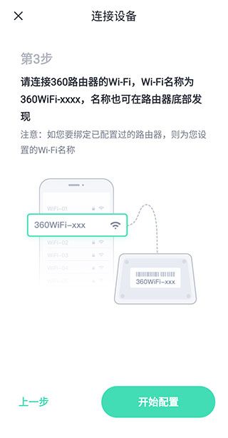 5、第3步请连接360路由器的Wi-Fi,Wi-Fi名称为360WiFixxxx,名称也可在路由器底部发现。但请注意,如您要绑定已配置过的路由器,则为您设置的Wi-Fi名称。