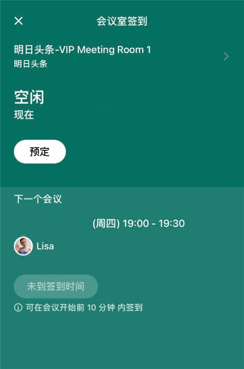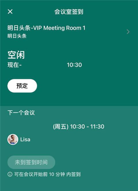 如果该会议室正处于空闲状态,签到页面将显示为绿色,可以点击预定即时预定会议室。