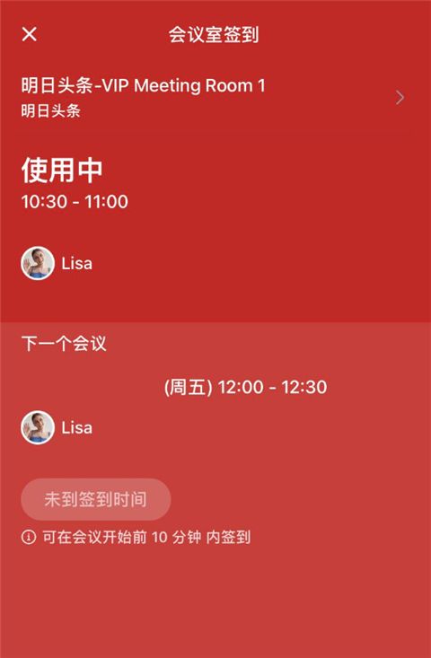 签到成功后,成员便可在预定时间内使用该会议室,此段时间内,签到页面将显示为红色,并提示会议室在使用中。