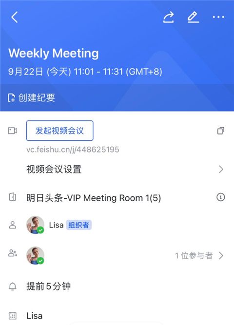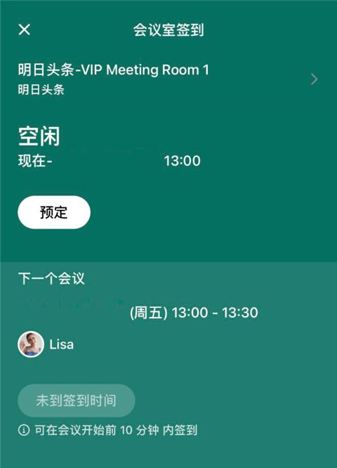 如果已到会议室的签到时间,签到页面将显示为蓝色,并提示日程即将开始/已开始,成员可点击签到。