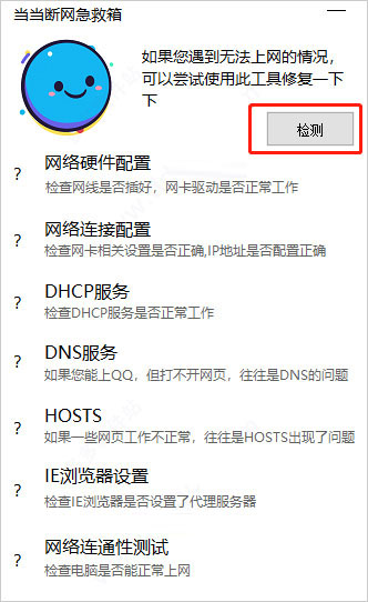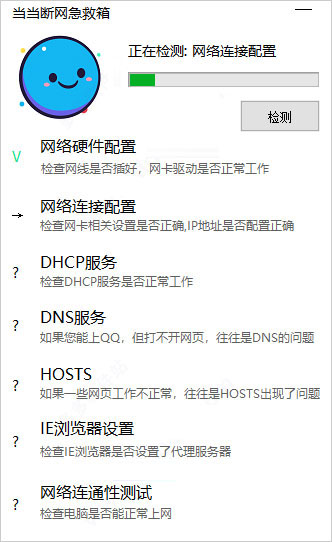 当电脑突然没网时怎么办?那可以试试小编带来的当当断网急救箱,这是由网友当当946制作的一款断网检测修复工具,绿色小巧,易携带,不过这不是重点,重点是可以轻轻松松的帮助用户检测网络硬件配置、网络连接配置、DHCP服务、DNS服务、HOSTS等多处,有效的帮助用户快速检测出断网的故障并进行修复,以助于您修复断网问题。而且,该当当断网急救箱毫无任何鸡肋功能和广告,使用起来也是相当的舒服,欢迎有需要的用户们免费下载体验。