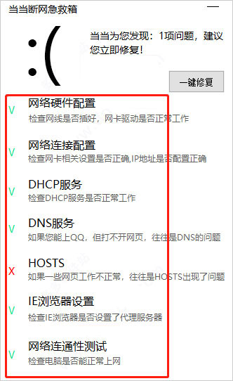 4、检测完成后,没问题的的直接会在前面出现绿色√,有问题就是红色的×啦,接着点击“一键修复”即可;