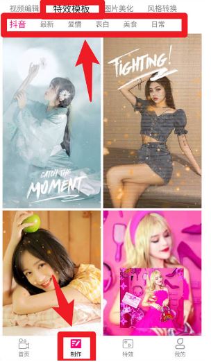 4、在特效模板区域,提供抖音、爱情、美食、日常等不同分类的热门模板,用户只需点击即可套用,让视频创作更高效。