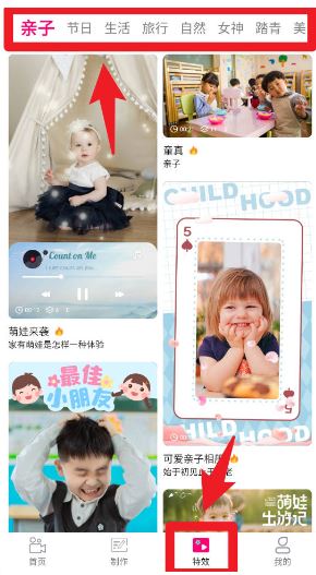 5、在特效板块中,还提供亲子、节日、旅行、自然等丰富的分类模板,满足不同场景需求,帮助用户轻松制作个性化作品。