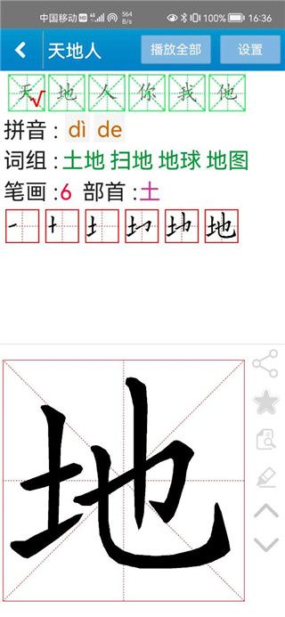 5、然后就可以开始啦,还有详细的拼音、词组、比划等;