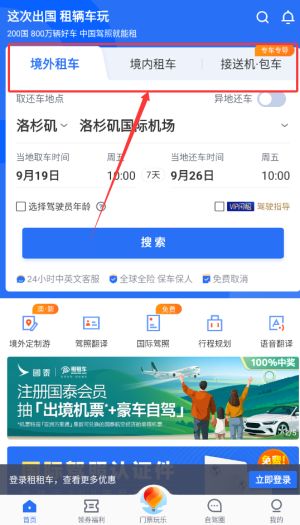 1、首页提供境外租车、境内租车及接送机包车等多样化出行服务选项。