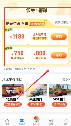 4、优惠券中心定期发放各类折扣券,可用于租车或门票消费抵扣。