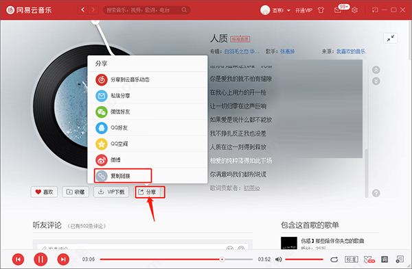 2、该软件支持下载许许多多的资源,不过这里小编这里就以网易云音乐为例,先打开网易云音乐需要下载的音乐,点击“分享”——“复制链接”