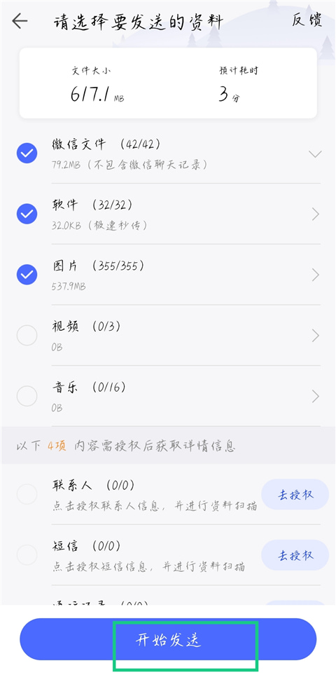 2、选择需要发送的资料,如微信文件、图片、音乐等,点击【开始发送】。