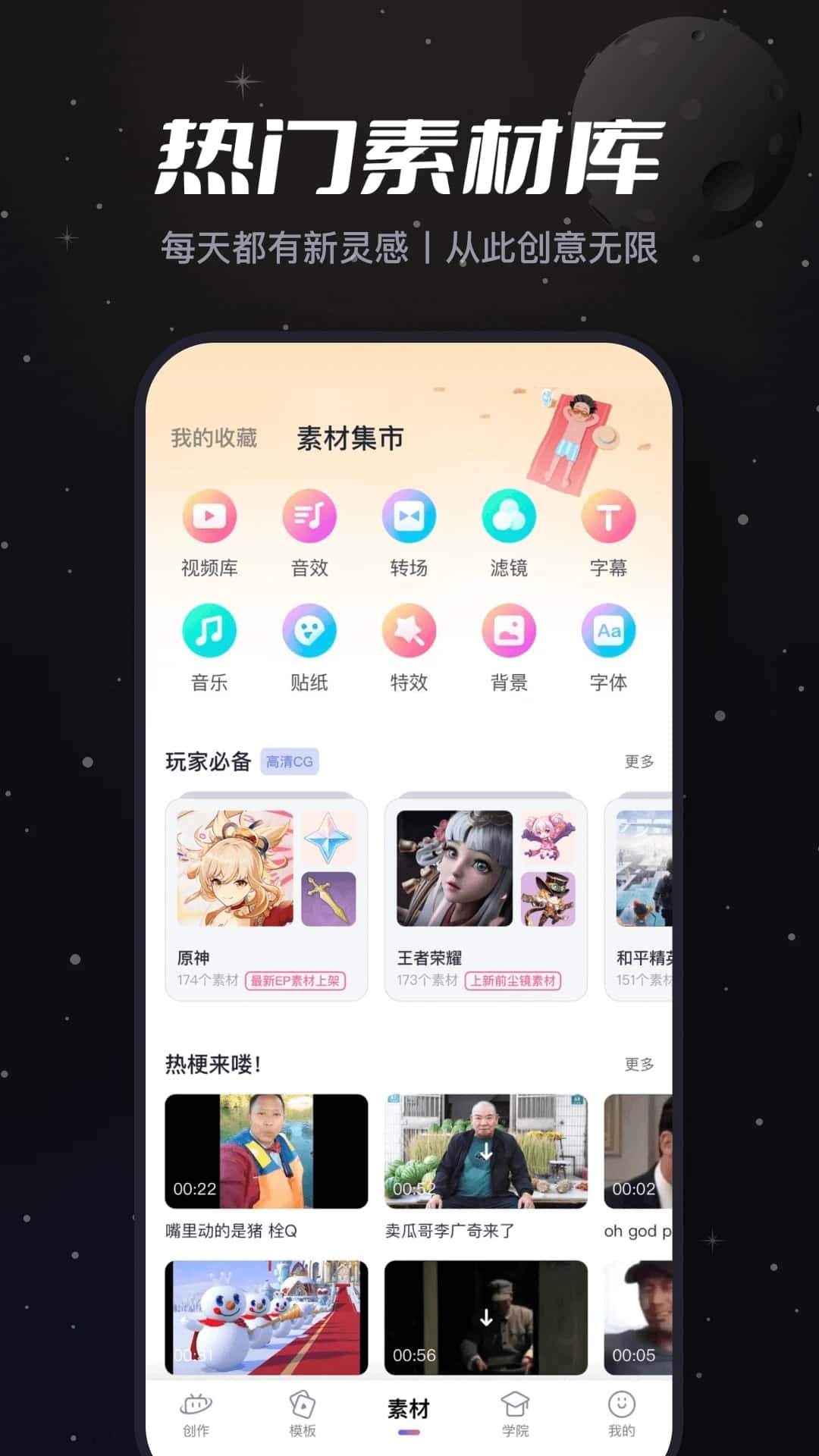 6、另外在必剪app的素材中心也为用户们提供了特效、贴纸、字幕、滤镜、背景、转场等海量内容。