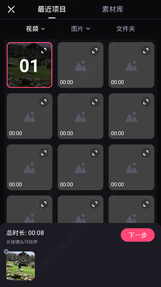 2、点击剪辑即可开启选择需要剪辑的素材,并支持选择多个素材内容;